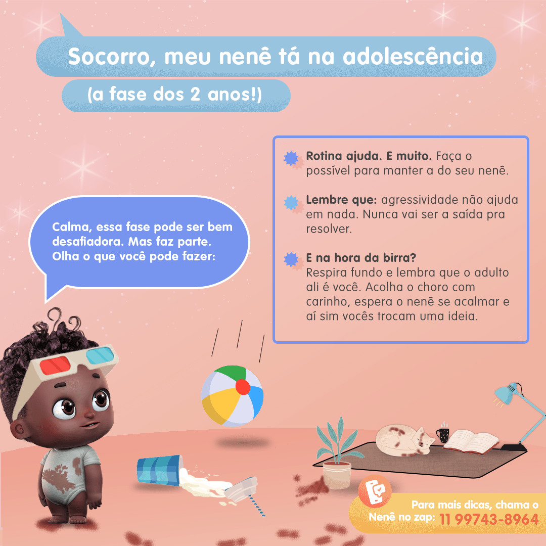 A primeira coisa legal de você saber, ex-nenê, é que isso tudo é absolutamente normal! Eu sei, essa fase é desafiadora mesmo. Mas o negócio é tentar ter paciência e mostrar para o nenê, quando ele tiver mais tranquilinho, que brigar e gritar não vai resolver o problema. E que ele não pode ter tudo o que quer, É assim que a nenezada aprende a entender os próprios sentimentos. E lembra de uma coisa: como toda fase, essa também passa!