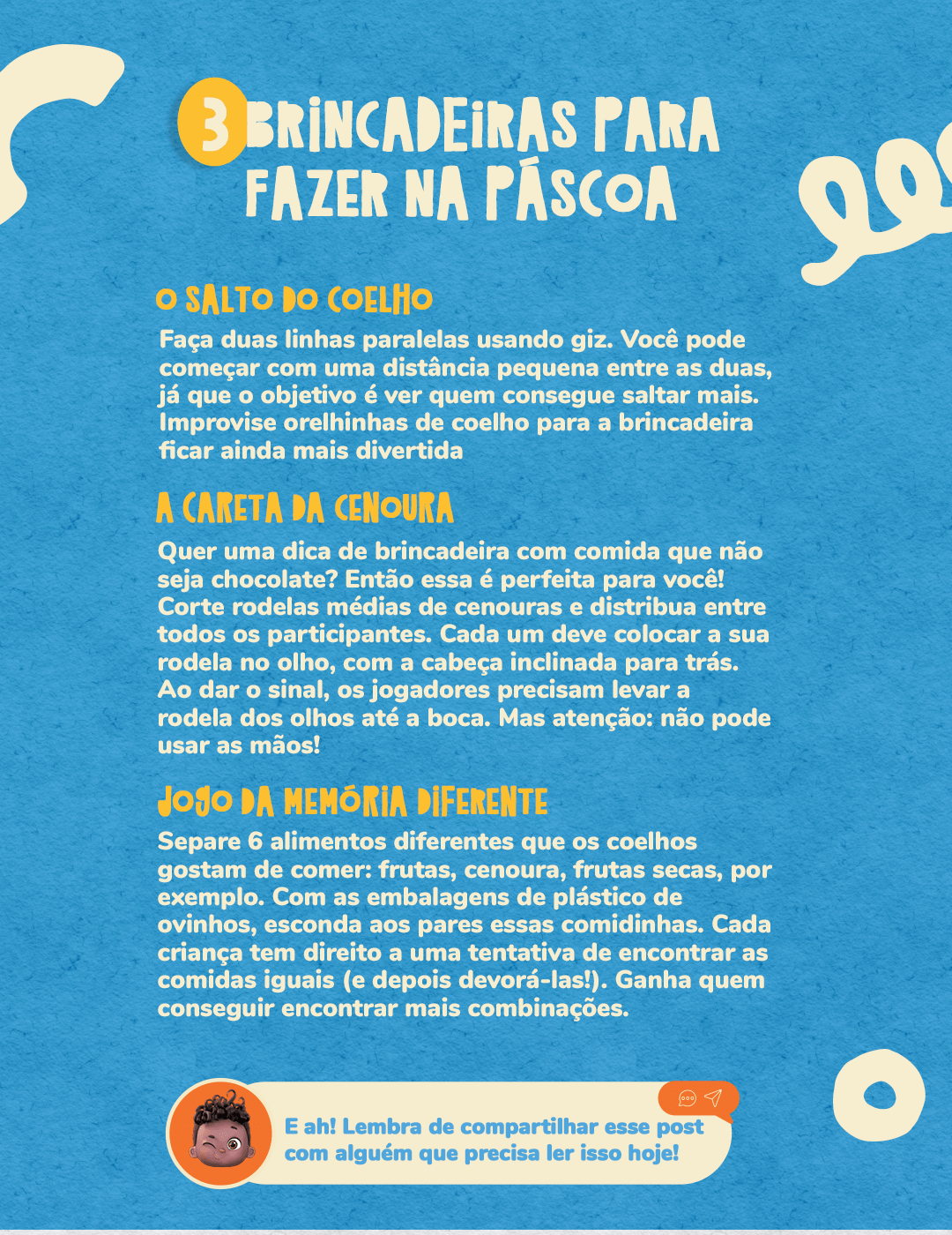 Oi, ex-nenês! A Páscoa tá chegando e eu reuni umas brincadeiras bem legais para vocês fazerem com a criançada! Passa pro lado e confere tudinho, hein?