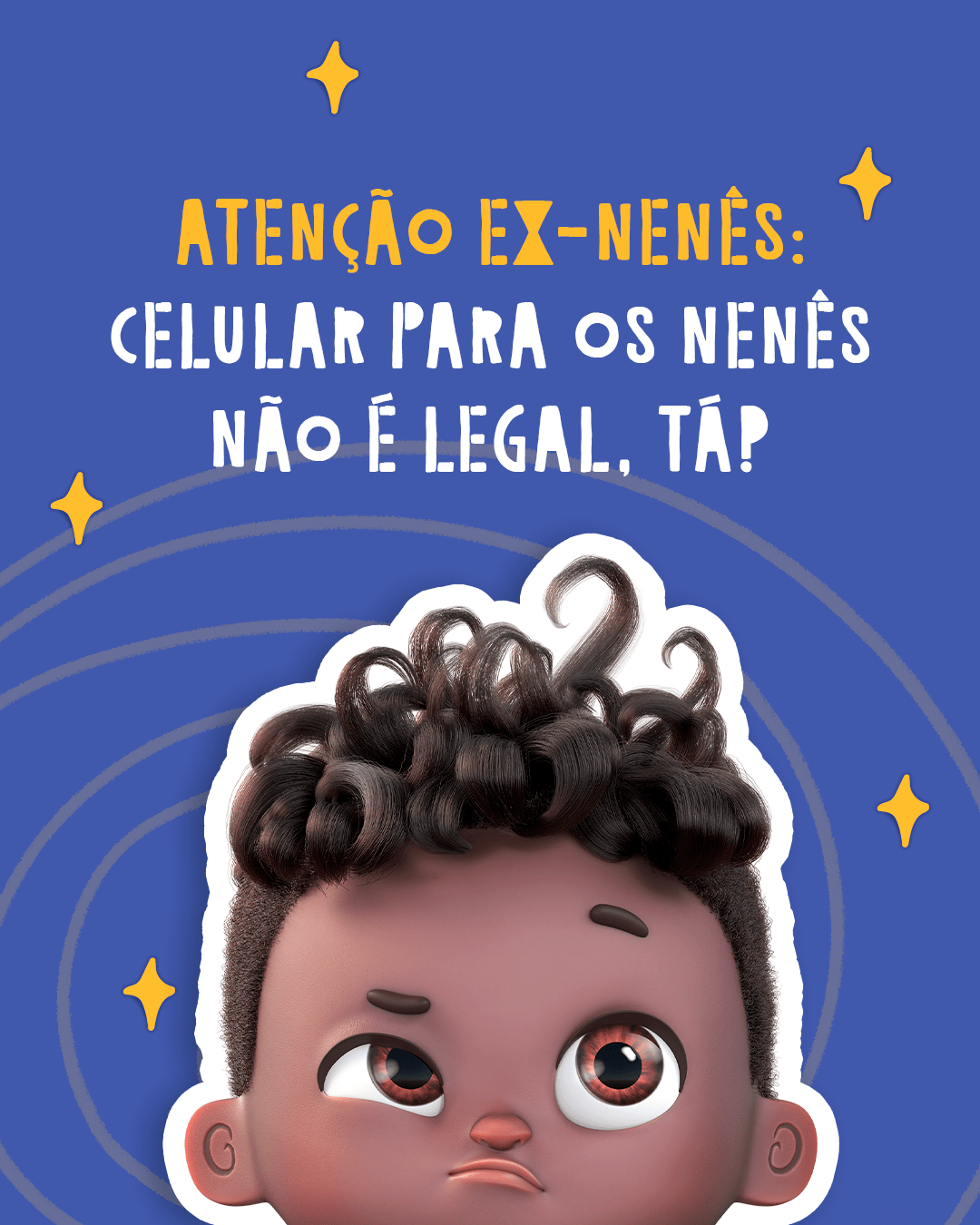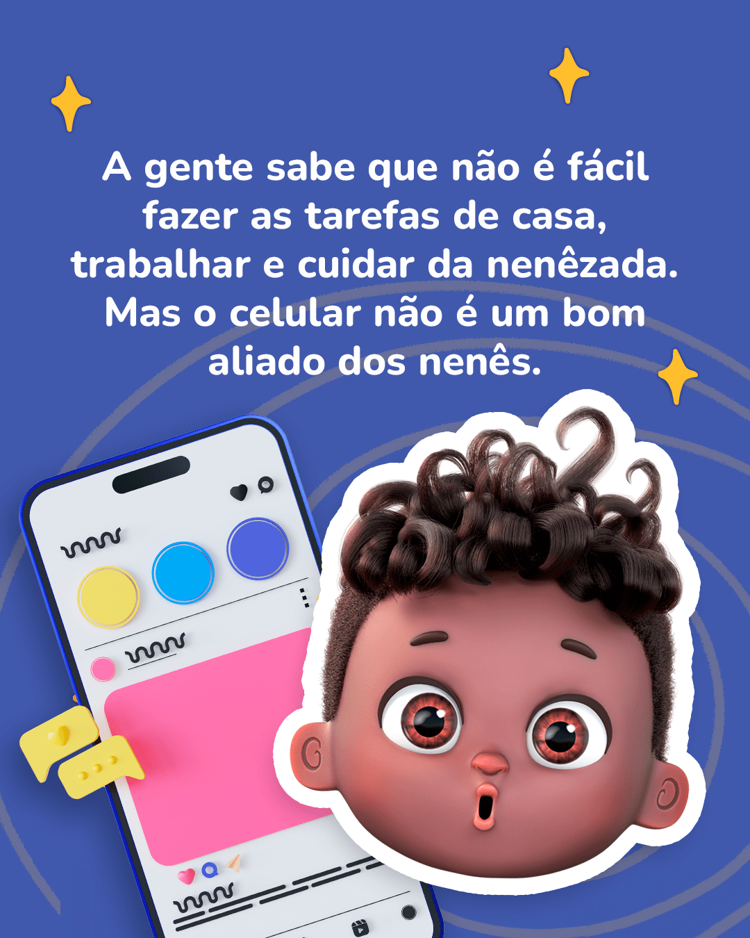 Celular não é brincadeira de nenê!Nenês e crianças precisam de interações de verdade com os seus cuidadores para crescerem felizes e saudáveis.Que tal trocar o uso das telas por mais momentos juntos? Seu nenê adora!