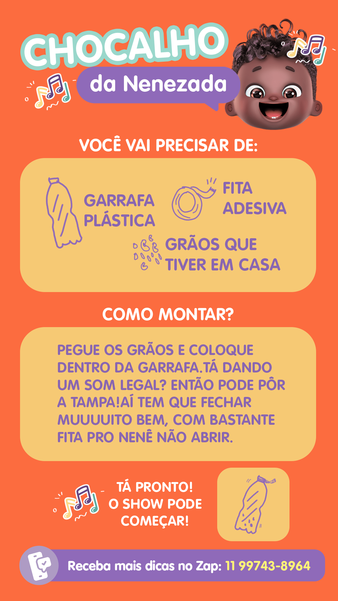 Depois de pronto, é legal você apresentar o instrumento pro seu nenê e aí deixar que ele mesmo explore os sons! Ele pode fazer isso sozinho, mas também é legal em alguns momentos você brincar com ele, seja cantando uma música, com outro chocalho, batendo palma ou o que mais sua imaginação deixar. E aí, vamo brincar?