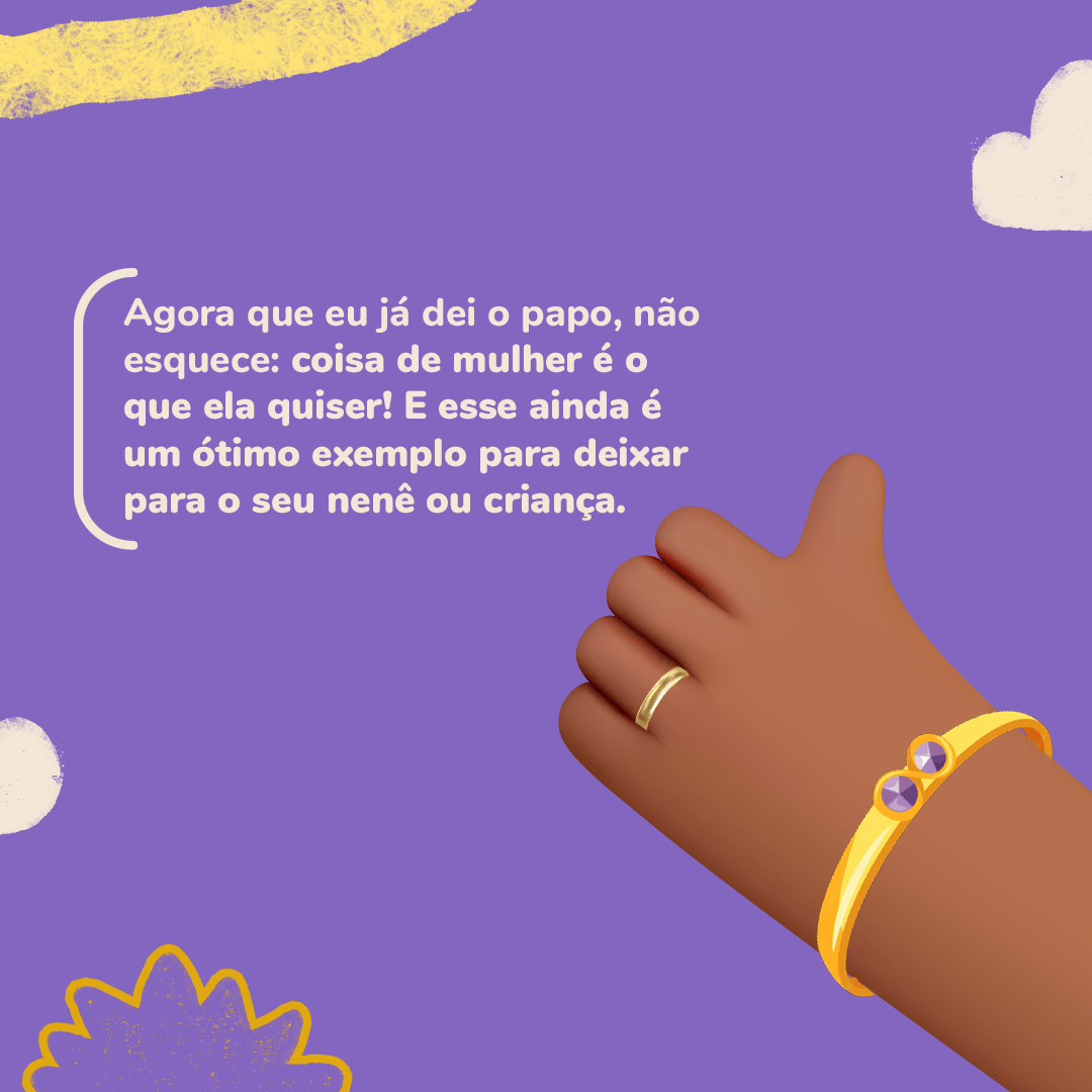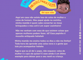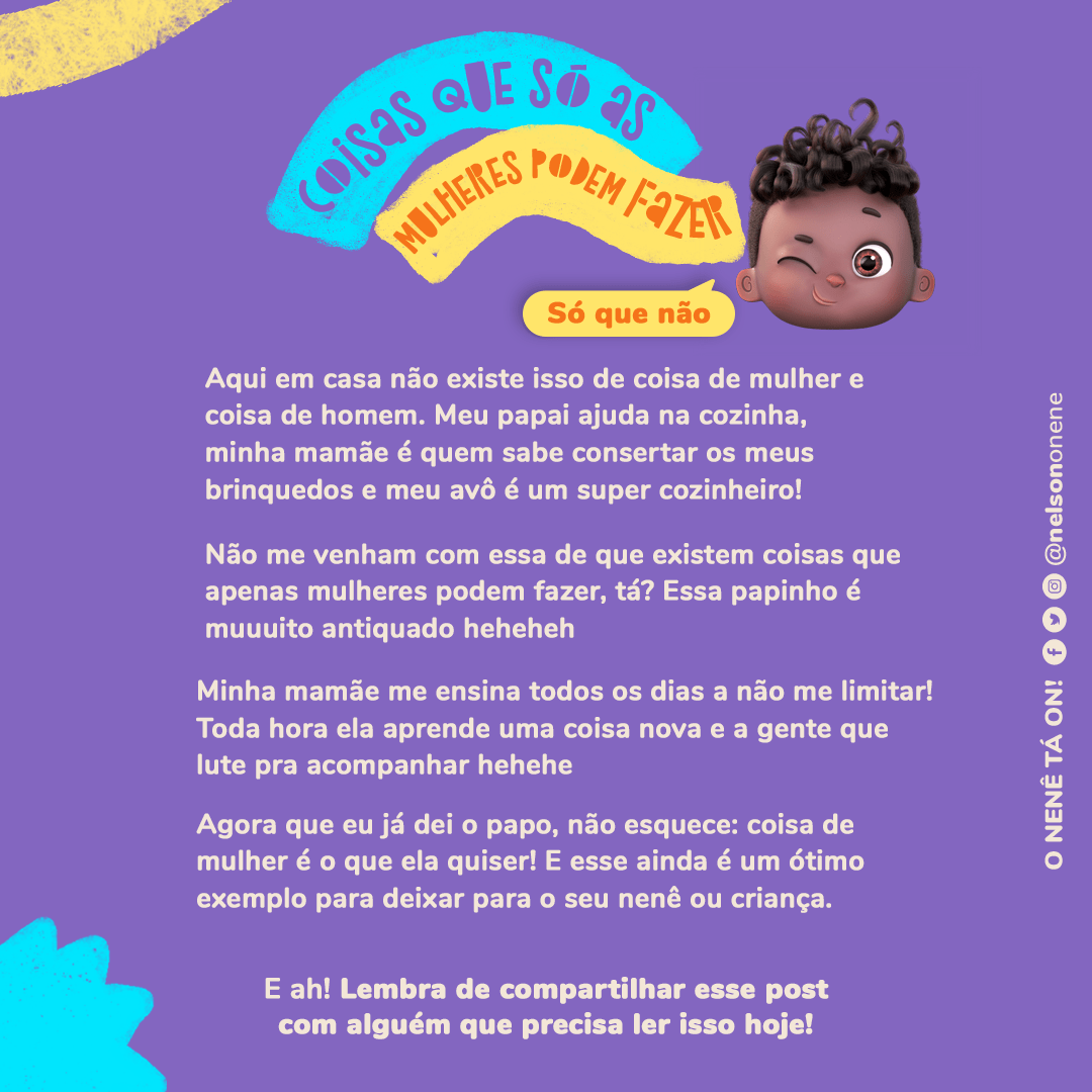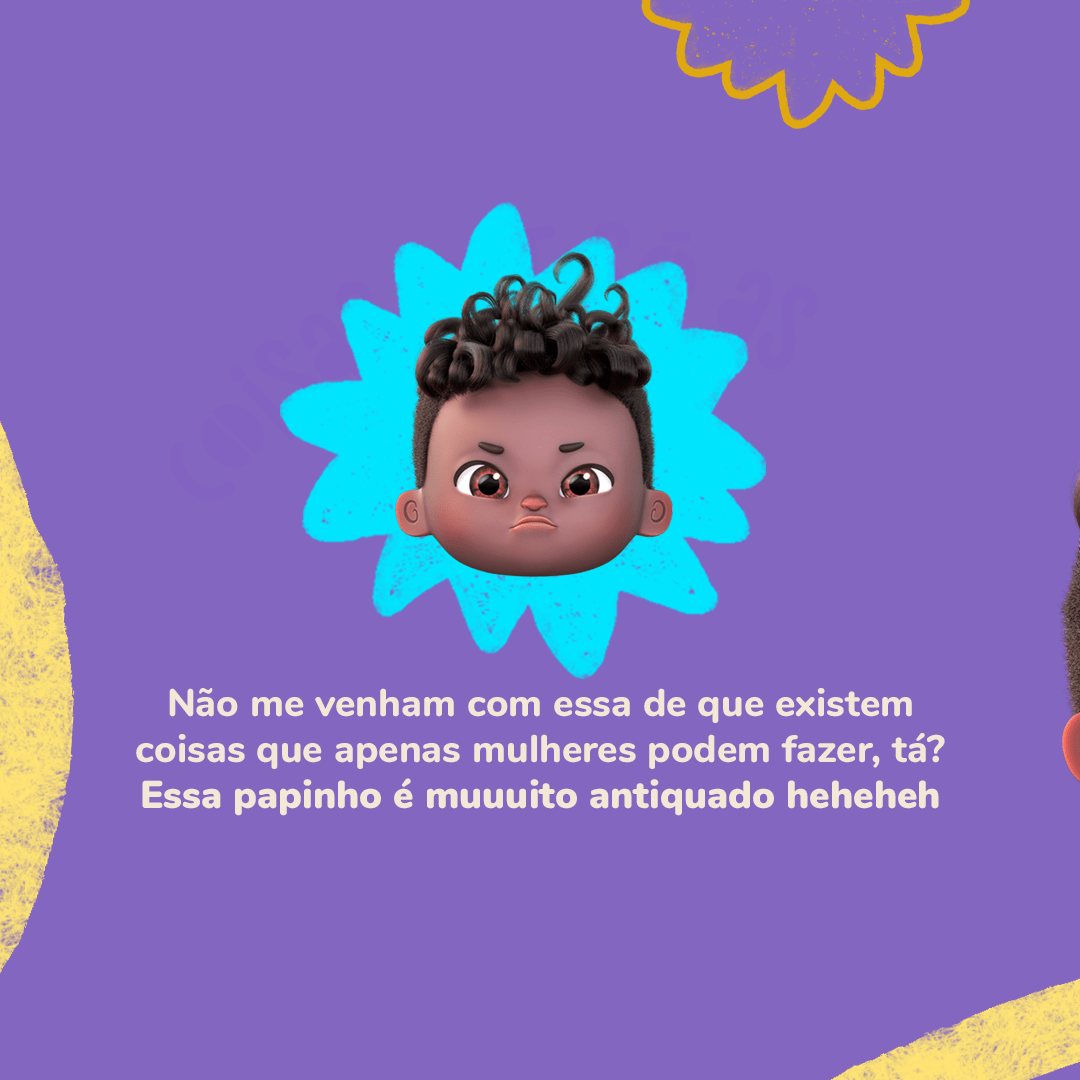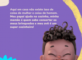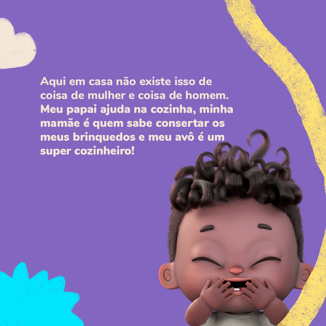 Aqui em casa não tem essa história de “coisa de mulher”... O meu avô faz uma feijoada deliciosa e quem lava os pratos depois é o meu pai (e muito bem, hein?). Eu por enquanto só ensaio nas panelinhas de brinquedo, mas um dia eu chego lá.. hihihih
