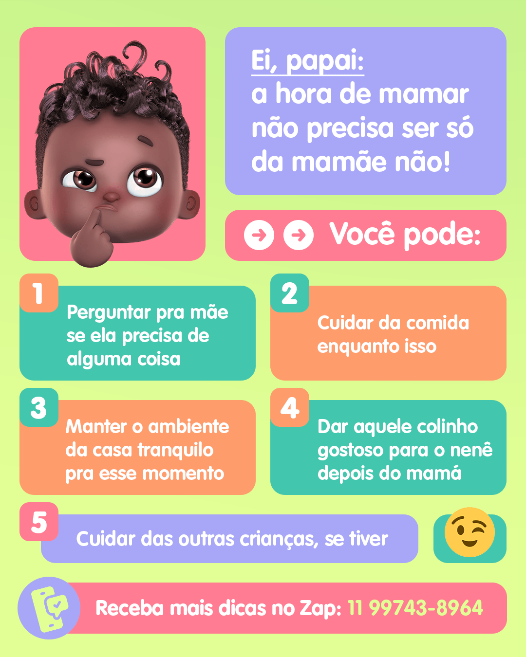 É verdade que dar tetê mesmo é só a mamãe que pode, mas todas as outras coisas de cuidar do nenê dá pro papai e a mamãe se dividirem, ao invés de um só ficar cheio de coisa pra fazer!