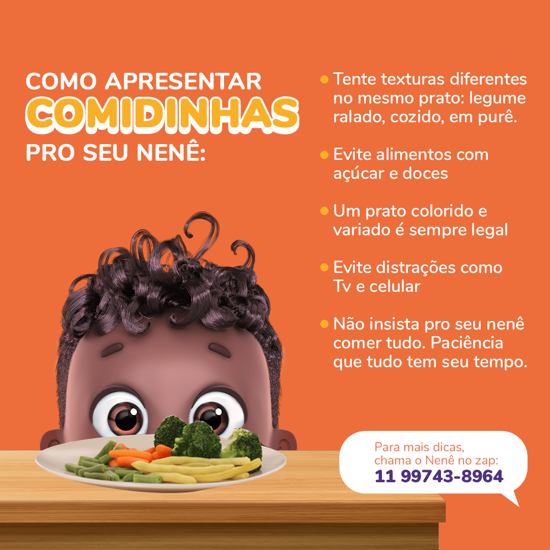 Depois de 6 meses só tomando leitinho, chegou a hora da gente provar frutas, verduras e legumes. E agora? Comece com calma e vá apresentando um alimento saudável por vez. Deixe o nenê conhecer o gosto, ver as cores, explorar texturas, tudo isso se divertindo no momento. Vai ter sujeira? Vai. Mas faz parte. Aos poucos o seu chefinho vai ter os seus sabores preferidos e vai até pedir mais.