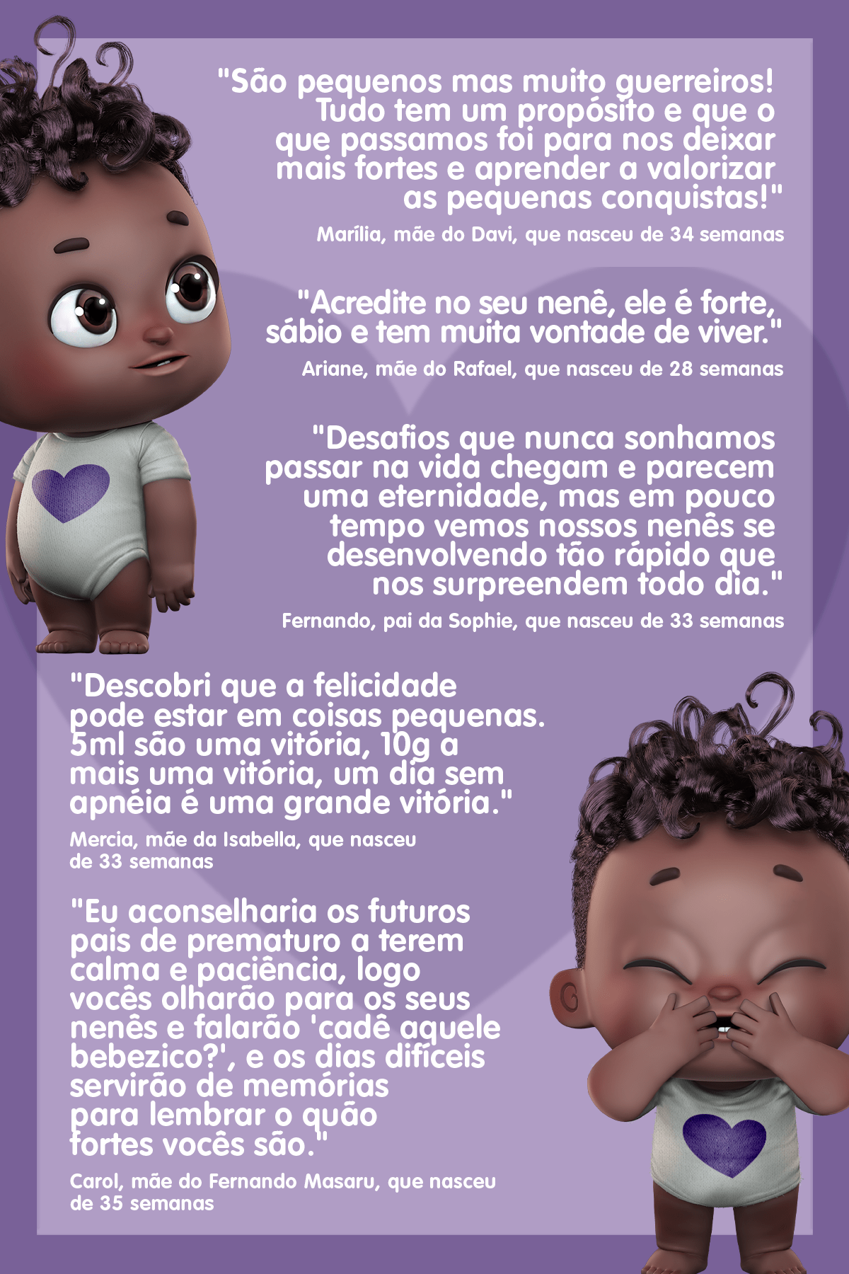 Sabe o que eu descobri hoje??? Que os nenês que nascem antes de ficar prontos pra sair do forninho são chamados de prematuros. Pois é, essa nenezada chega toda apressada pra ganhar o mundão! Mas, alguns precisam ficar mais fortinhos primeiro e, pra isso, precisam de muito amor e cuidado! Sabe quem também precisa de um carinho especial? Mamães e papais de prematuros. Eles passam por um bocado de coisas que a gente nem imagina, haja coração! E por falar nisso, eu conheço alguns desses ex-nenês que toparam abrir o coração e compartilhar um pouquinho de como é viver essa experiência. E você que teve um nenê prematuro, se identificou?