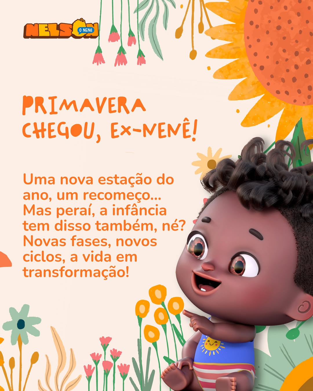 Muita gente acha a primavera uma das épocas mais lindas do ano! E com razão, né ex-nenê? As árvores ganham flores, as ruas ficam coloridas e tudo parece mais bonito mesmo. Fiquei pensando nessa coisa das estações do ano, nessas fases da natureza, e acho que lembra bastante a infância. Nosso crescimento é feito, afinal, de ciclos. Passamos por muuuuuuitos deles, cada um com suas belezas, seus desafios, e perceber tudo isso é muito forte e potente! Quase como um videogame, sabe? Quando achamos que dominamos uma fase, que ficou tudo fácil, logo vem outra mais difícil, hihihihi!!! Assim é a vida, assim é a natureza. Que bom que sempre há recomeços.