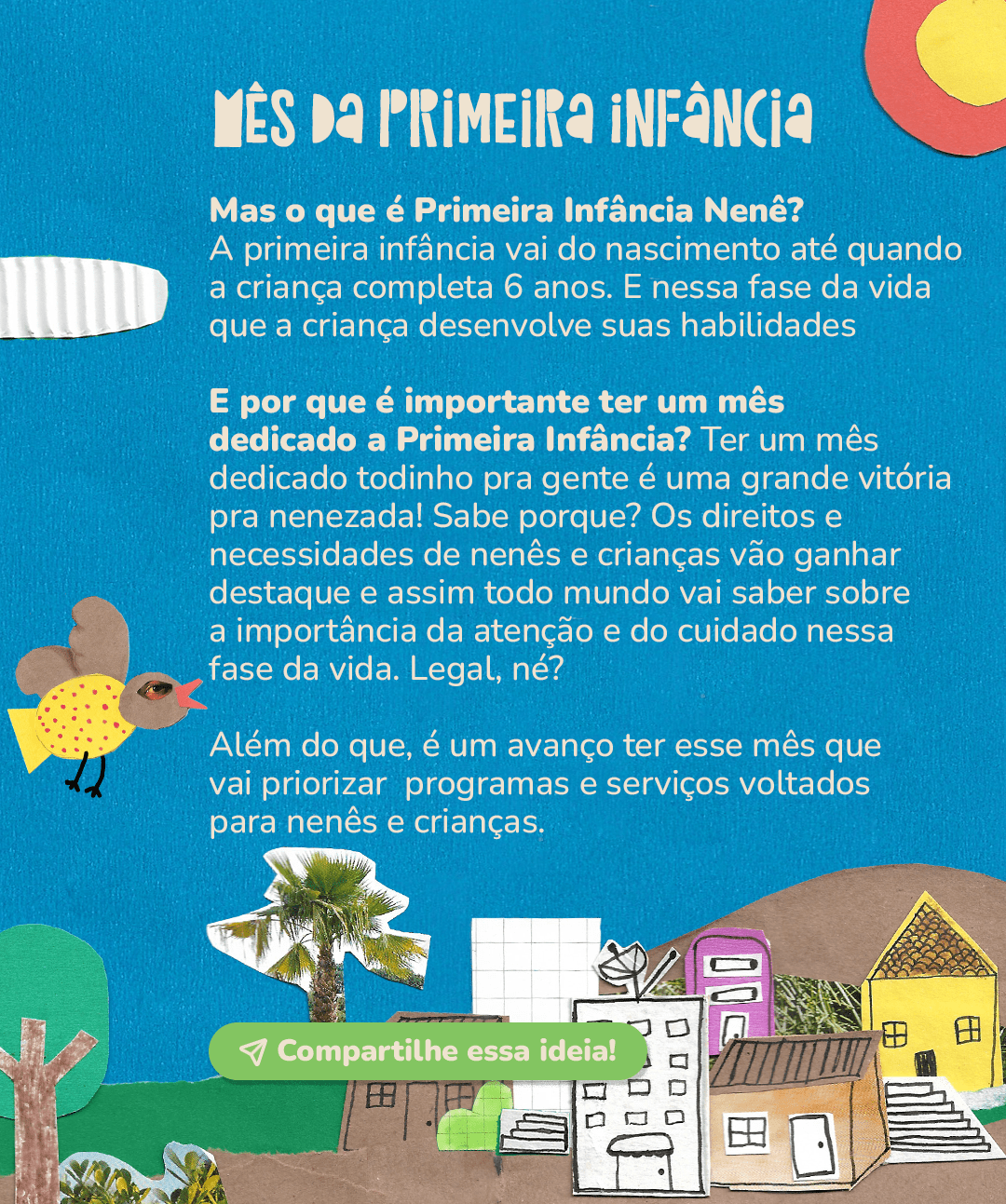 Ter um mês dedicado todinho pra gente é uma grande vitória para a nenezada, pois os direitos e necessidades de nenês e crianças vão ganhar destaque e assim todo mundo vai saber sobre a importância da atenção e do cuidado nessa fase da vida. Legal, né? Além disso, é um avanço ter esse mês que vai priorizar programas e serviços voltados para nenês e crianças.