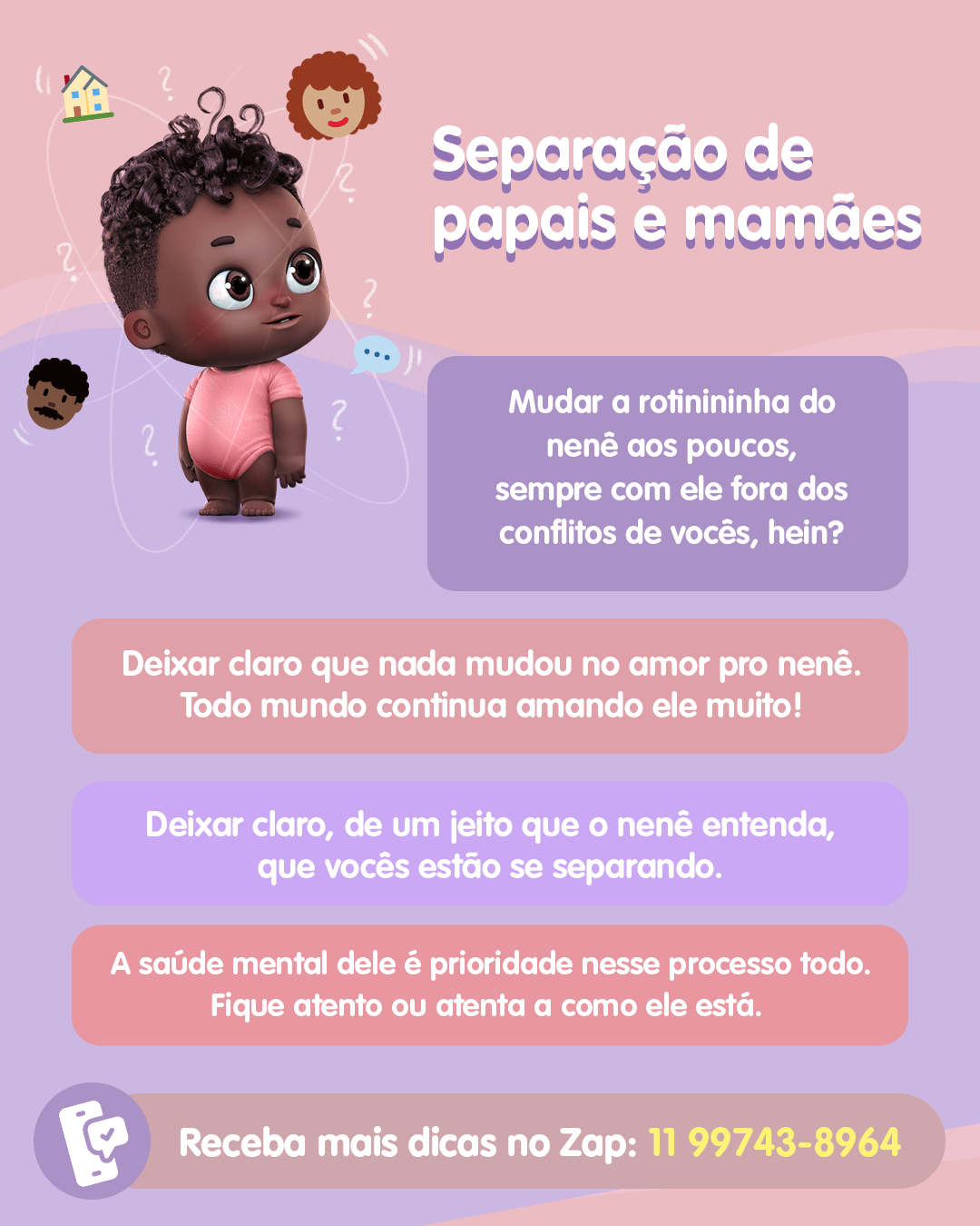 Alguns ex-nenês, especialmente agora na pandemia, acharam melhor não morar mais na mesma casa e escolheram se separar. Tem famílias que funcionam melhor assim! Isso traz um monte de mudança, até de casa, né? Agora imagina tanta coisa nova na cabeça pequenina de um nenê!